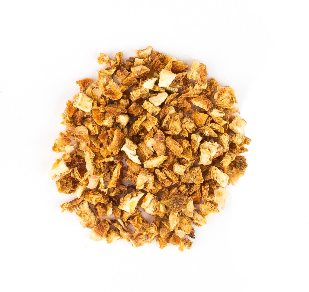 Orange Peel, infused, can help aid digestion and may serve as an expectorant for coughs, especially when there's filmy phlegm present. Does not contain caffeine.